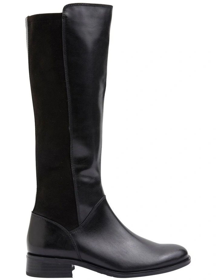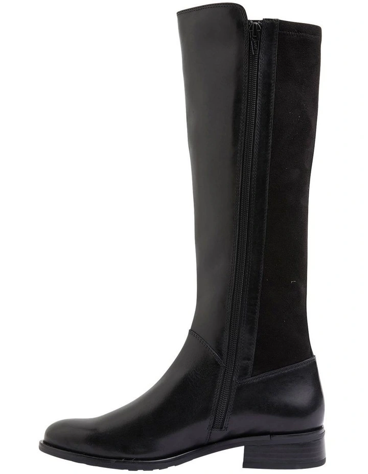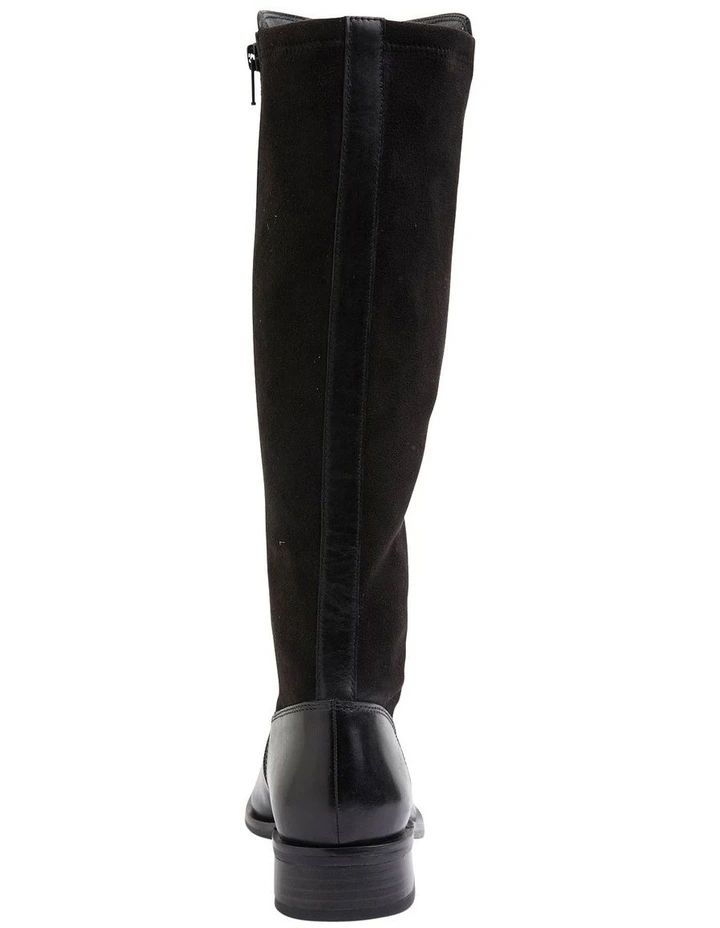 Knee high boots are back better than ever this season, and we are loving the simple yet elegant silhouette of ALASTAIR. Crafted with two panels of soft leather and suede-like fabric, this boot also features a comfortable low block heel, inside zipper and classic round toe.Â