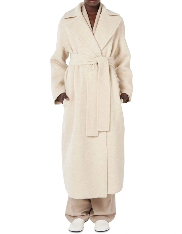 The Alpaca Wool Coat is a chic and cozy essential to elevate your winter wardrobe. The Alpaca Wool Coat made in a heavy wool and alpaca felted, brushed fabric in a beautiful snow colourway. Highlighted with a detachable belt to cinch your waist, handy side pockets and a functional back vent. Featuring a luxurious wide lapel and collar, finished with hand top stitching.Â