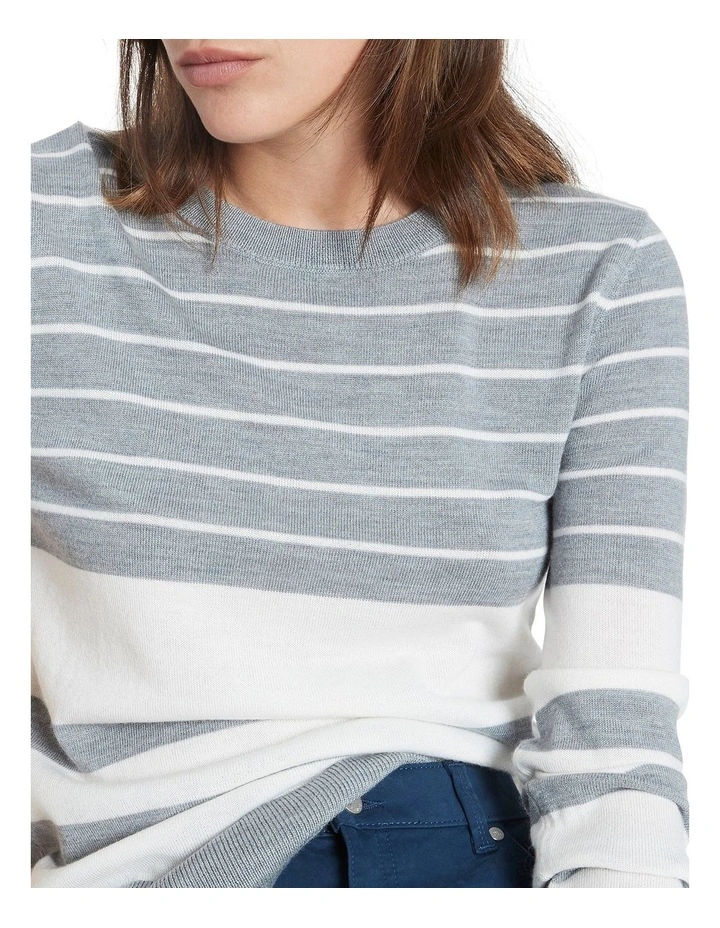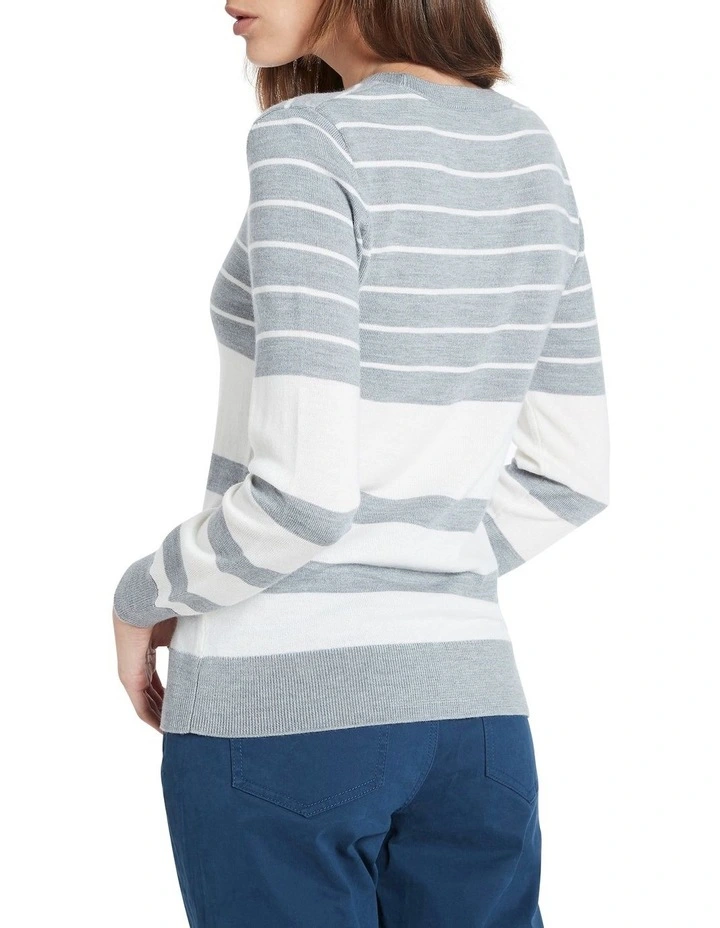 Made from pure Australian Merino wool, this long sleeve knit top feels exquisitely soft against the skin, revealing an easy-wearing horizontal stripe in shades of grey and ivory. Offering a slim fit through the body and sleeves, the top is completed by fine rib trim detailing at the rounded neckline, sleeve cuffs and straight body hem.