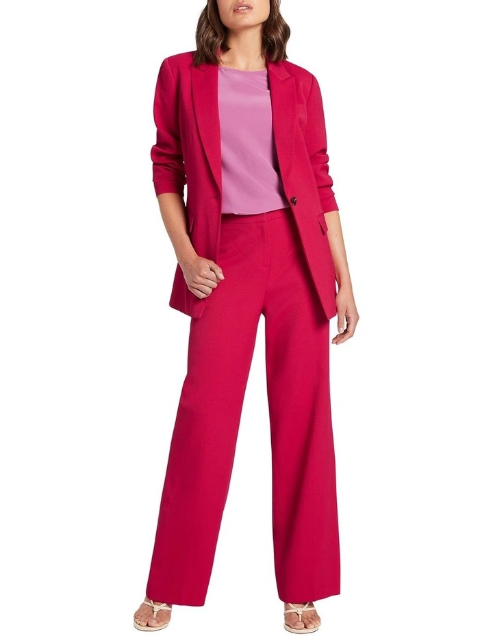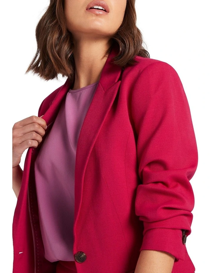 Feeling soft and lightweight within its European linen blend, this blazer makes a statement with colour as it showcases a bold strawberry jam hue. Fully lined, the blazer fastens in a single-breasted design to reveal a sleek longline silhouette, which is perfectly accentuated by details that include statement contrast buttons, flap pockets at the hip, and a sharp lapel and collar.