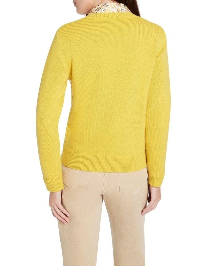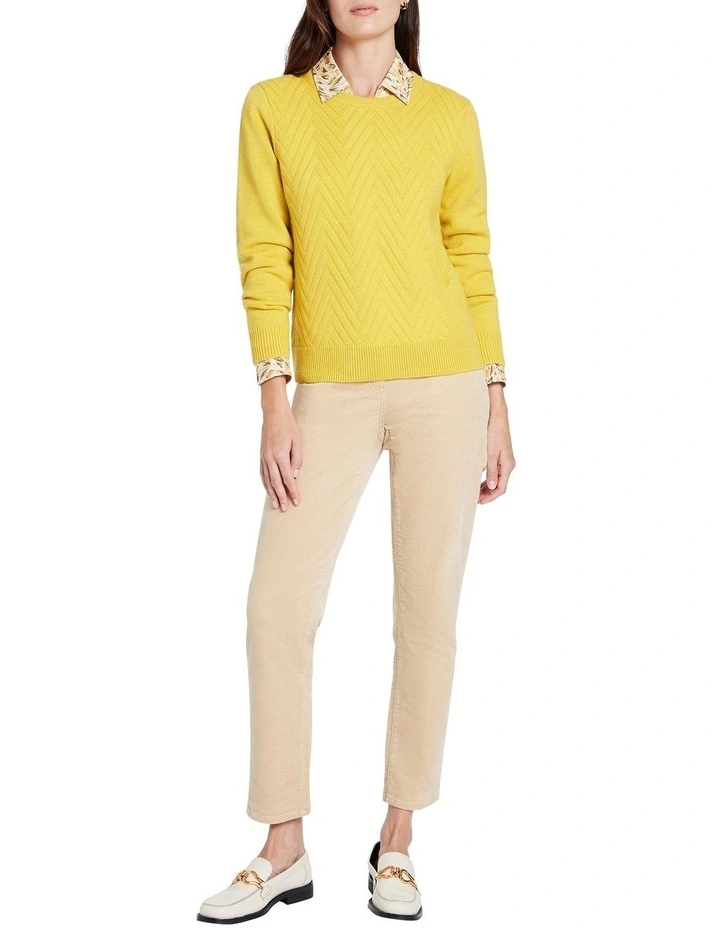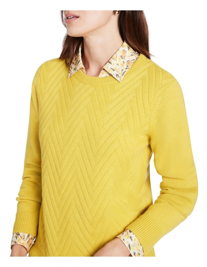 Pushing away those winter blues, this slim fit, long sleeve knit sweater looks captivating in lemon yellow as it wraps you up in pure Australian Merino wool. Intricately detailed, the sweater shows off a textured basketweave knit stitch through the front of the body, accentuated by rib trim at the crew neckline, sleeve cuffs and straight body hem.
