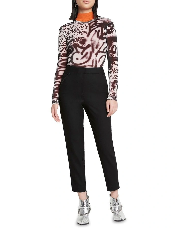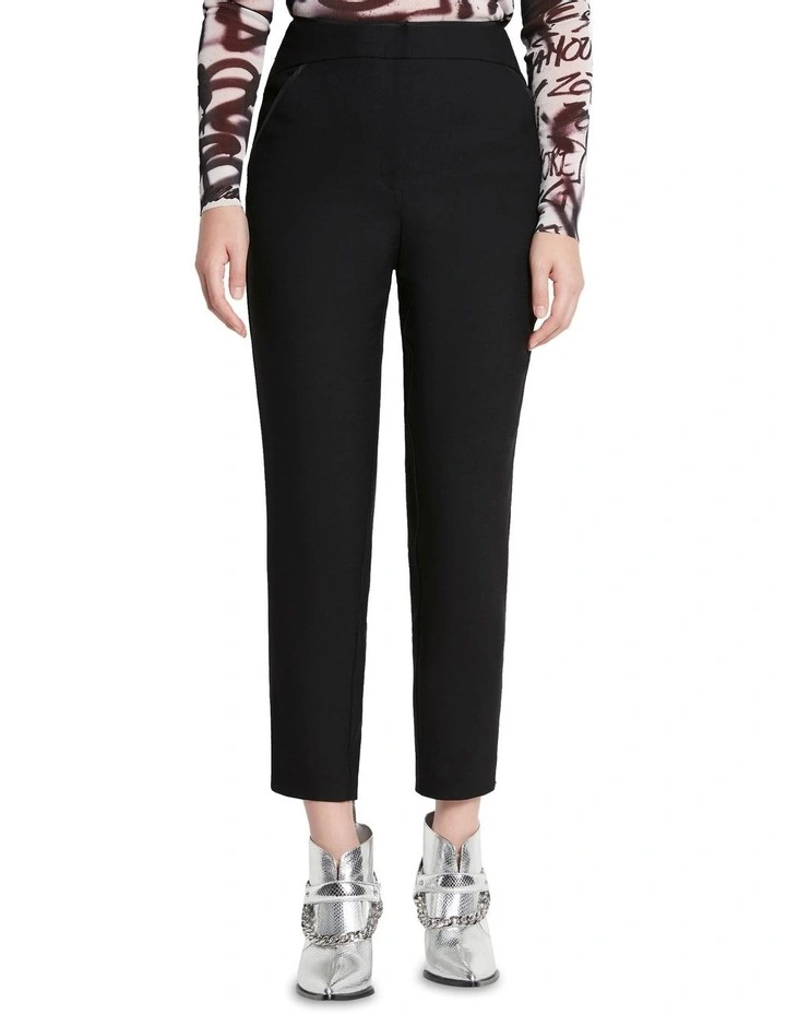Made from a soft wool blend, these black pants feature a subtle stretch for a flattering fit, descending from a neat waist through a slim fit leg to a cropped ankle length. Retaining clean lines throughout, the pants fasten at the front with a concealed closure, and are completed by hidden pocketing at the hip, with contrast trim both at the pockets and at the top of the waist.