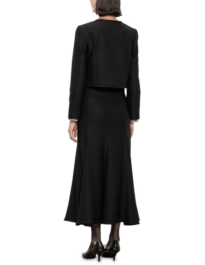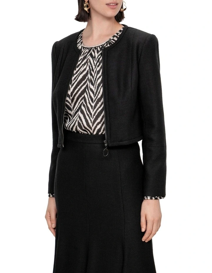 Tailored in a boucle fabrication, this classic style jacket features modern finishings for an updated look. Designed with a collarless neckline and shaped panels, this jacket offers a structured finish. Style with a funnel neck knit and relaxed tailoring.