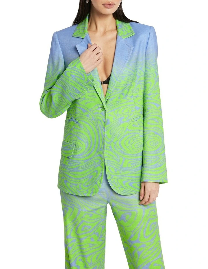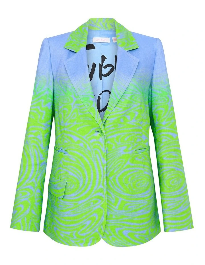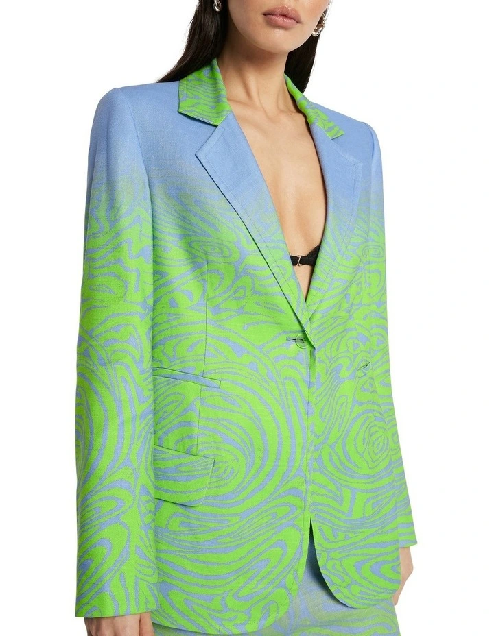 Creating an ombr effect in swirling shades of neon green and blue, this blazer keeps things lightweight and flowing, as it descends through a relaxed, straight fit in a soft linen blend. Fully lined, the blazer fastens in a neat single-breasted style, to show off additional detail in faux welt pockets at the waist, a single flap pocket at the hip, and a centre-back vent for movement.