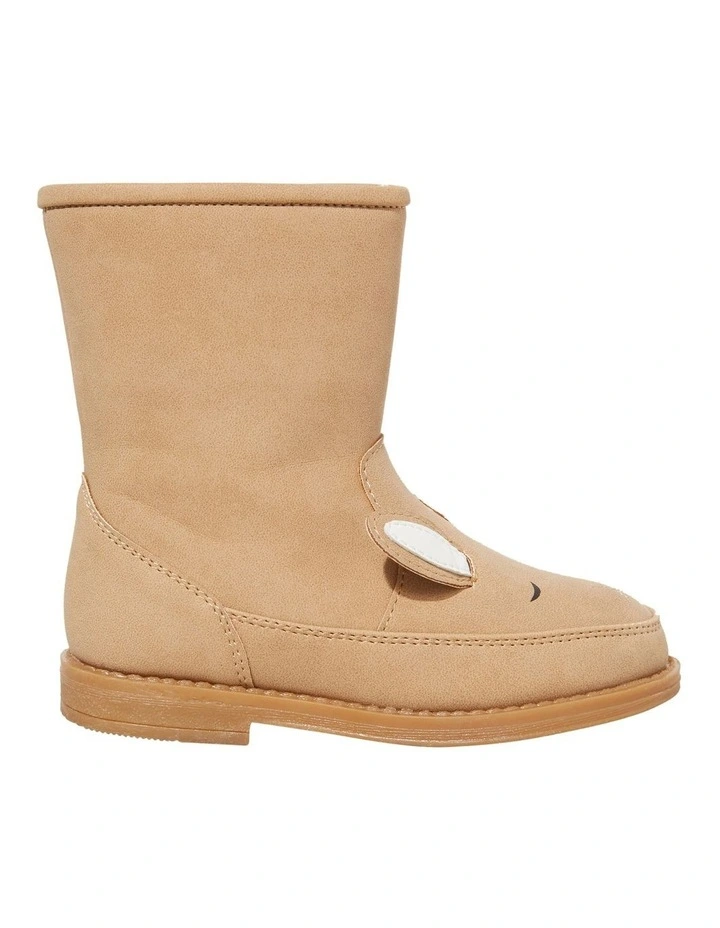Keep little feet warm in these novelty bunny boots. Smiling up from the toe is a little bunny face, and the soft, nubuck look boot is partially lined with a luxe faux fur. The boots have a slight heel for comfort, and a zipper opening for easy wear.