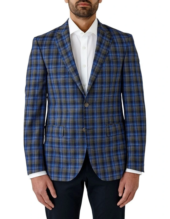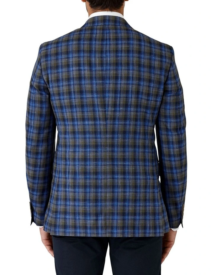 A deep khaki base with a bright blue and navy bold overcheck and fine linen slubs in a stone colour running through a standout jacket that will look fantastic at any summer event.
