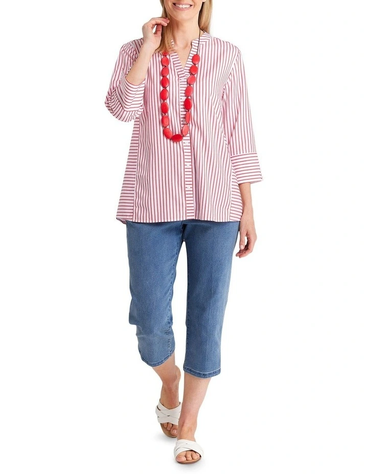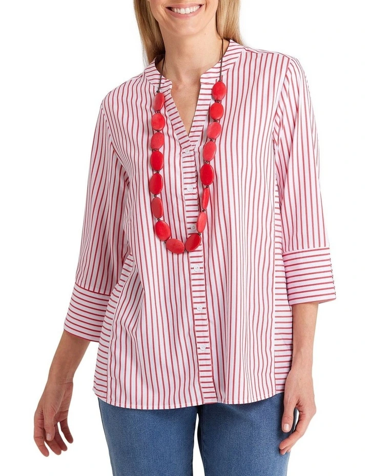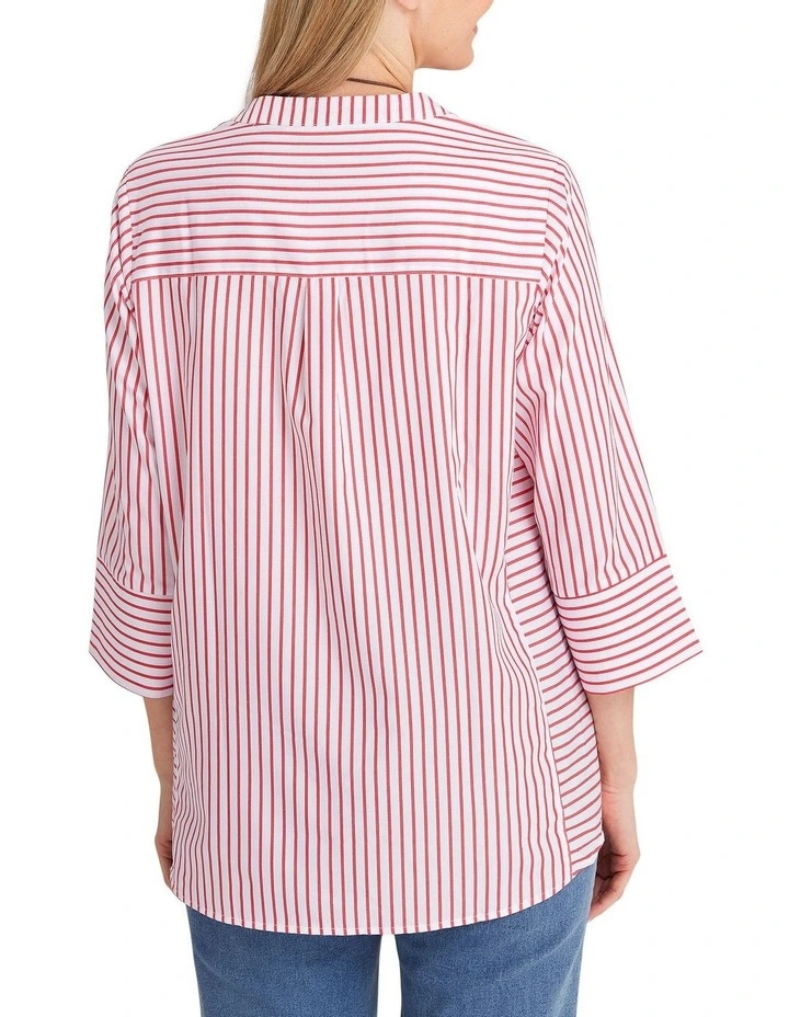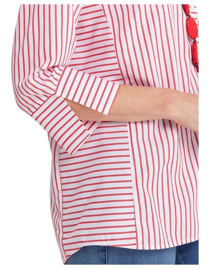 The shirt features a split neck, 3/4 sleeves, and a curved hi low hem. The split cuff and back yoke with inverted pleat add a touch of style, while the button front makes it easy to wear. The shirt is also adorned with panels of stripe pattern, giving it a fashionable and editorial look.