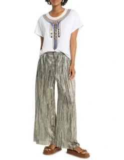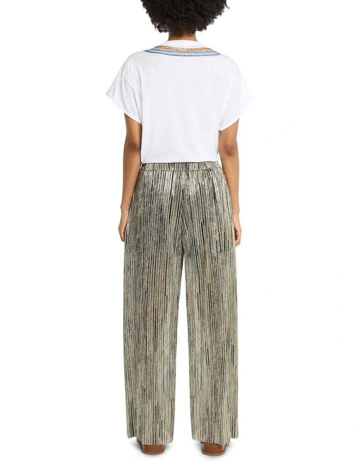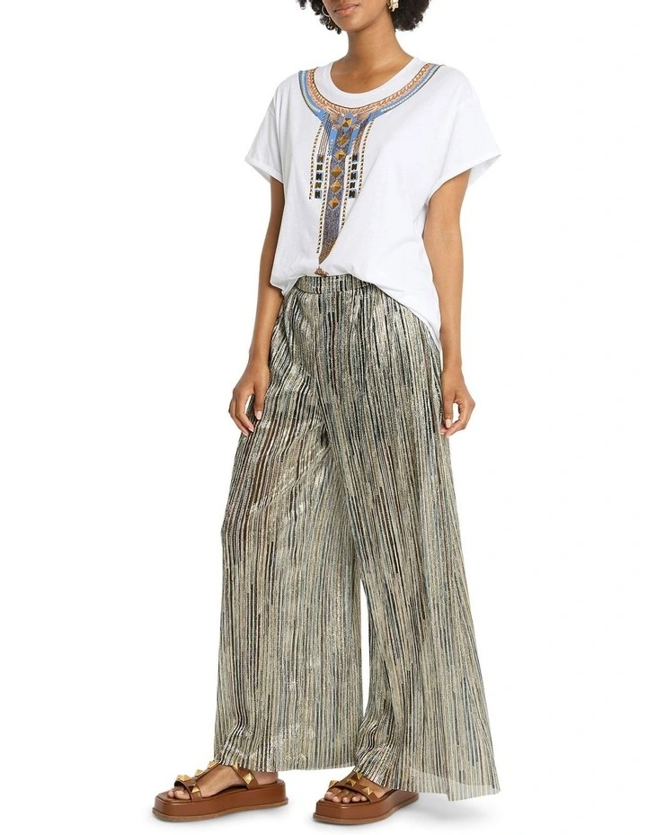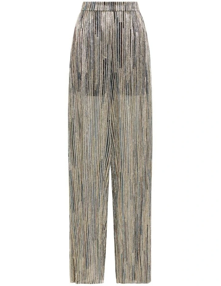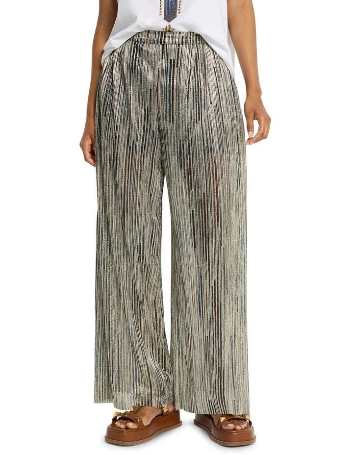 Sweeping through dramatic wide leg shaping, these palazzo pants look absolutely gorgeous as they show off shimmering metallics within an elegant stripe, descending to a voluminous full length hem. Made from a lightweight, semi-sheer fabric, the pants feature black shorts lining for modesty, and are completed by an elasticated waistband that sits at the natural waist.