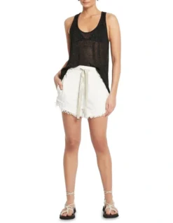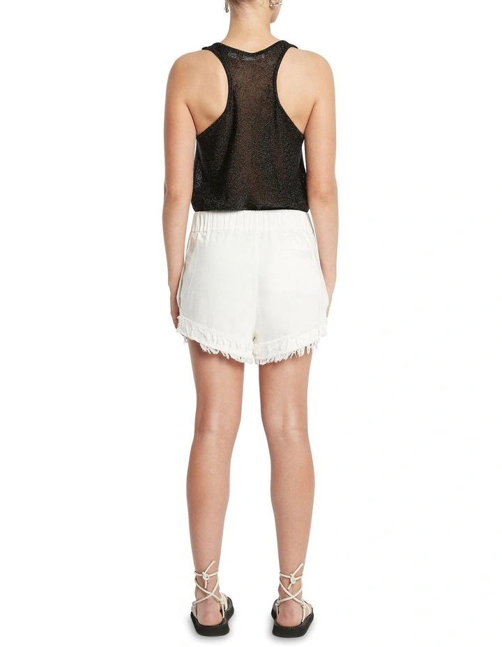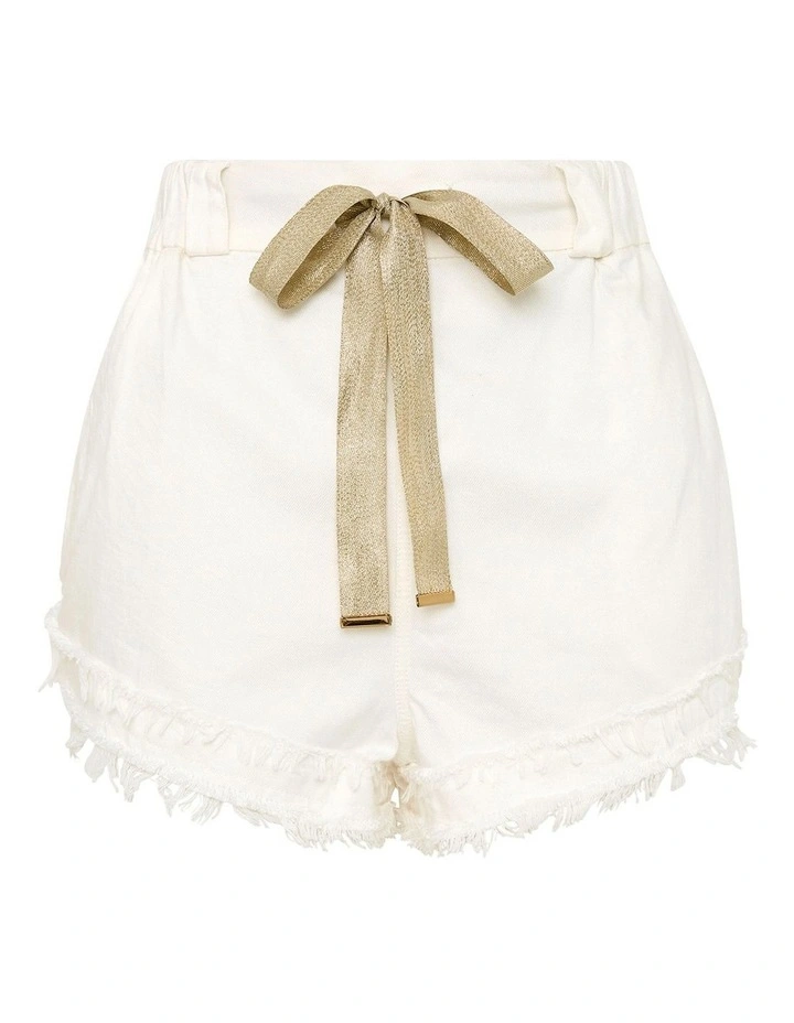 Effortless in their shaping, these gorgeously easy-wearing shorts create a relaxed fit within a pull-on style, perfectly accentuated by a metallic tie at the front of the waist. Flowing through a soft blend of Tencel and cotton denim, the shorts pair crisp ivory colouring with details that include layered frayed edge hems, angled pockets at the hip, and a single welt pocket at the back.