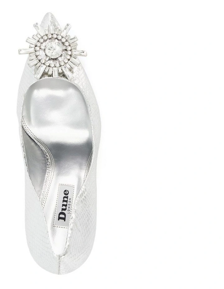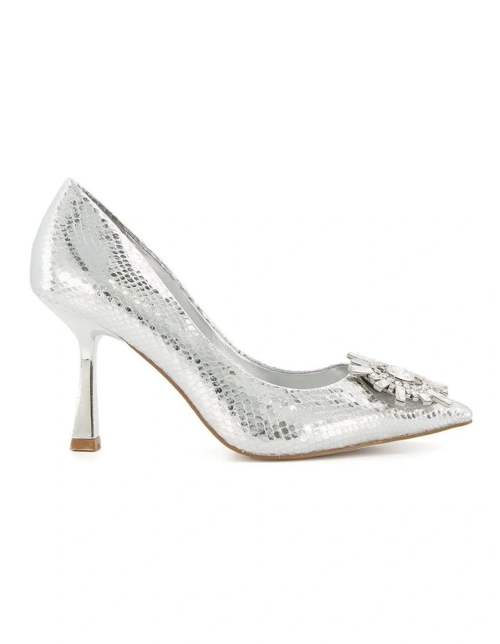 A twist on the traditional court shoe style. Adorned with a sparkling brooch and a unique square stiletto heel. These shoes provide instant glamour and individuality.