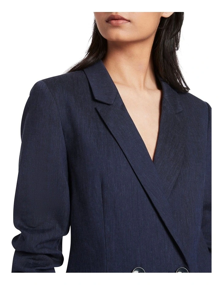 Softly tailored to reveal a flattering longline silhouette, this blazer feels soft to the touch in an effortless linen blend, showing off a rich navy melange colouring. Fully lined to enhance its shaping, the blazer fastens in a double-breasted design, to flaunt further detail in welt pockets at the hip, faux button cuffs, and a centre-back hem vent for movement.