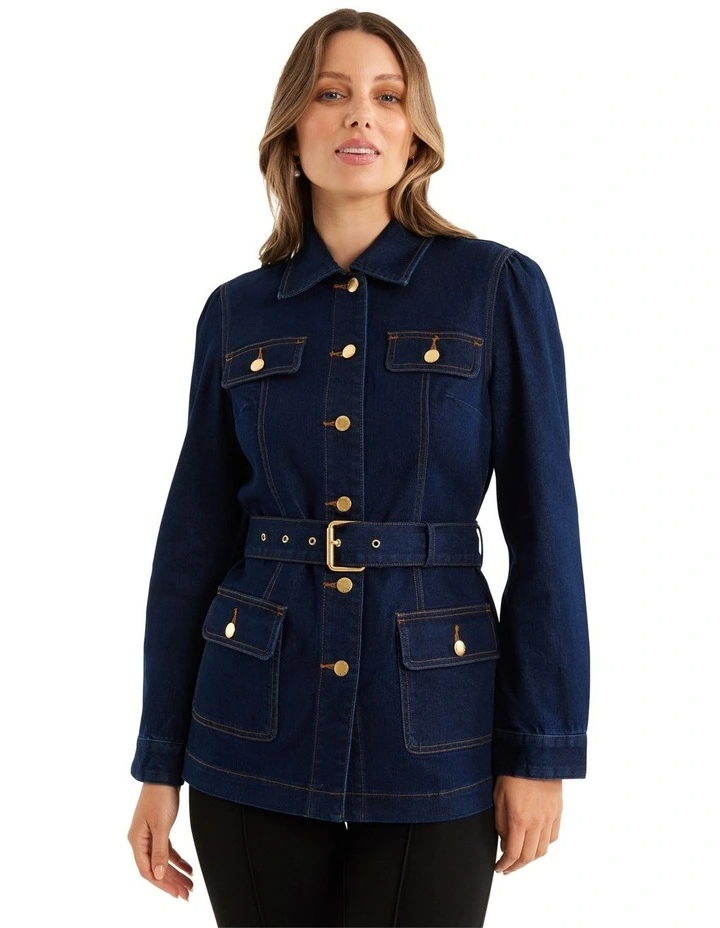 Introducing the Frankie Denim Jacket is cut from a premium quality indigo wash denim, featuring a classic collar, full-length sleeves and a fitted silhouette for a flattering look. The button-through front and front pockets provide sophistication, finished off with a self-fabric belt and soft gold buckle to cinch in your waist for a defined look. Defined by its soft gold Review branded hardware to add a touch of elegance to your outfit. The Frankie Denim Jacket in a indigo blue wash is a versatile addition to your wardrobe that will keep you looking stylish and on-trend all year round. Wear yours with the matching Frankie Jeans for your next event.