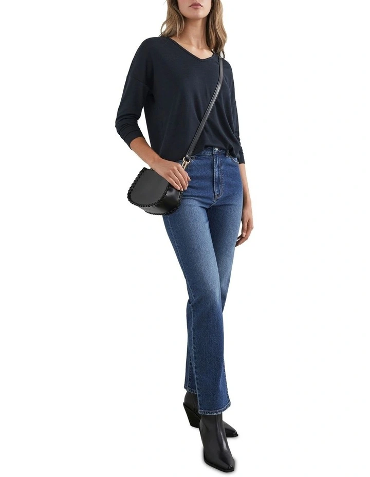 Our Soft V-Neck Long-Sleeve T-shirt is an elevated take on a wardrobe staple. Light and stretchy, this tee features a V neckline and long sleeves with a drop shoulder. Wear with our Flare Jean and Annette Leather Boot.Â
