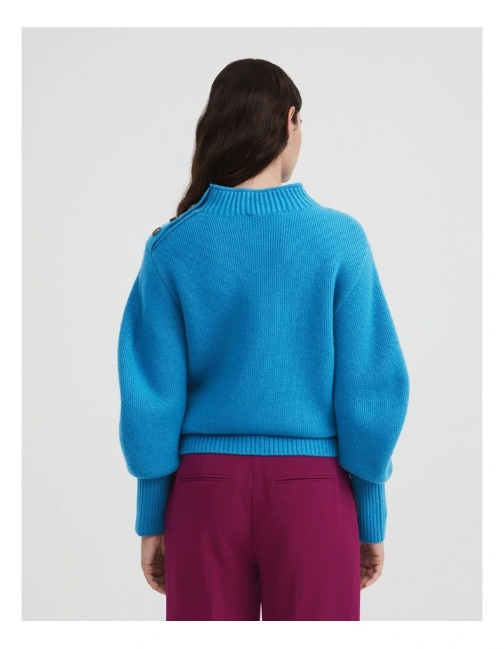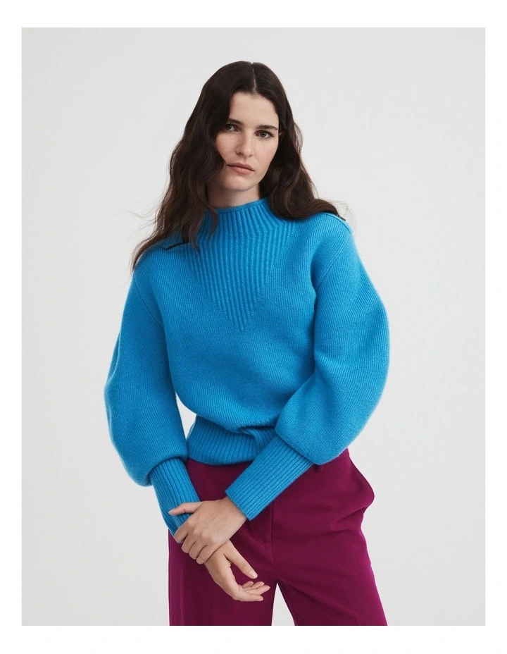 - Voluminous puff sleeves; elongated ribbed cuffs