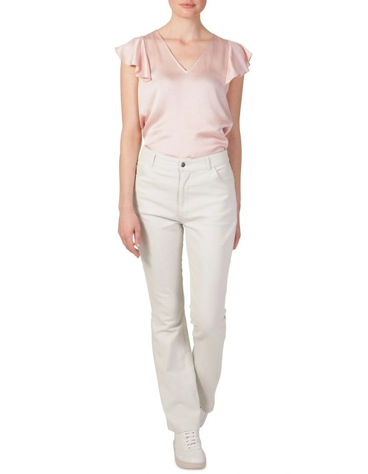 A highwaisted denim pant with traditional denim styling and a flared leg. Featured in our fresh snow colourway, great for spring styling.