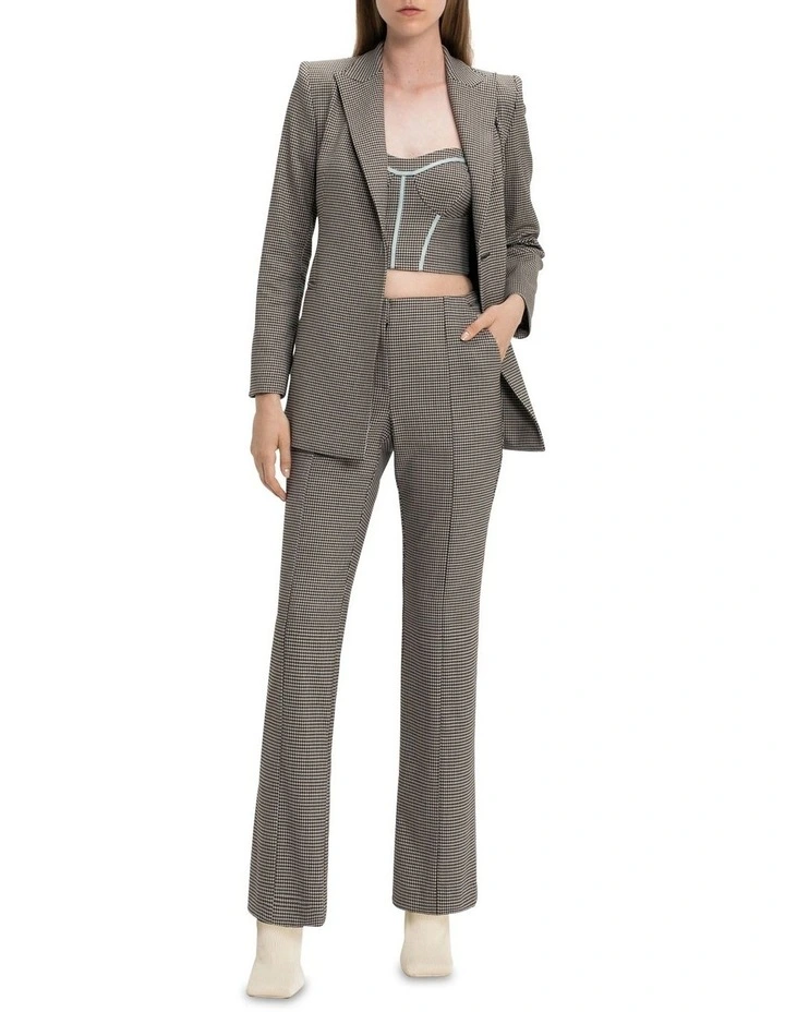 Cut from duck egg houndstooth, which contains 66% recycled polyester and 33% EcoVero viscose. Featuring a peaked lapel collar and finished with welt pockets. Style back with matching pant and bodice for a modern feminine look. Fully lined.