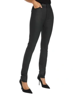 Curving close over the hip from a flattering high waist, these jeans work to elongate the leg as they deliver ultimate stretch within a super skinny silhouette. Accentuated by a sleek black coated finish, the jeans flatter further with detail that includes pocketing front and back, belt loops at the waist, and a classic button and concealed fly front closure.
