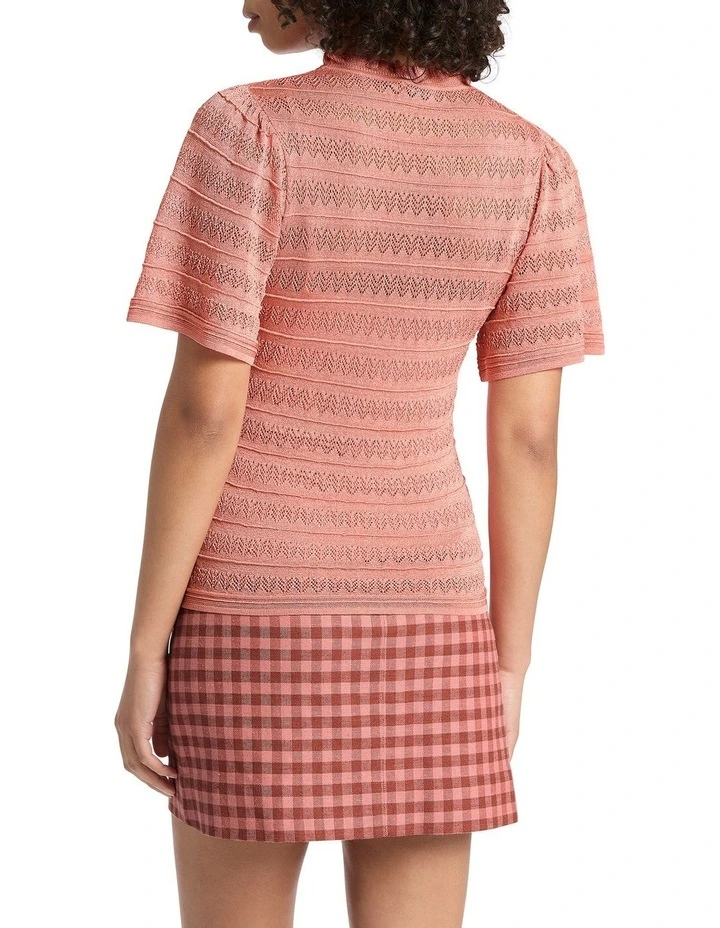 Revealing shimmering metallic accents within strawberry pink, this knit top uses a lightweight knit stitch to create a delicate, semi-sheer look, which can be worn with or without the complementary cami top. Offering stretch through its flattering slim fit, the top is further accentuated by short bell sleeves and soft frill detailing at the high neckline.