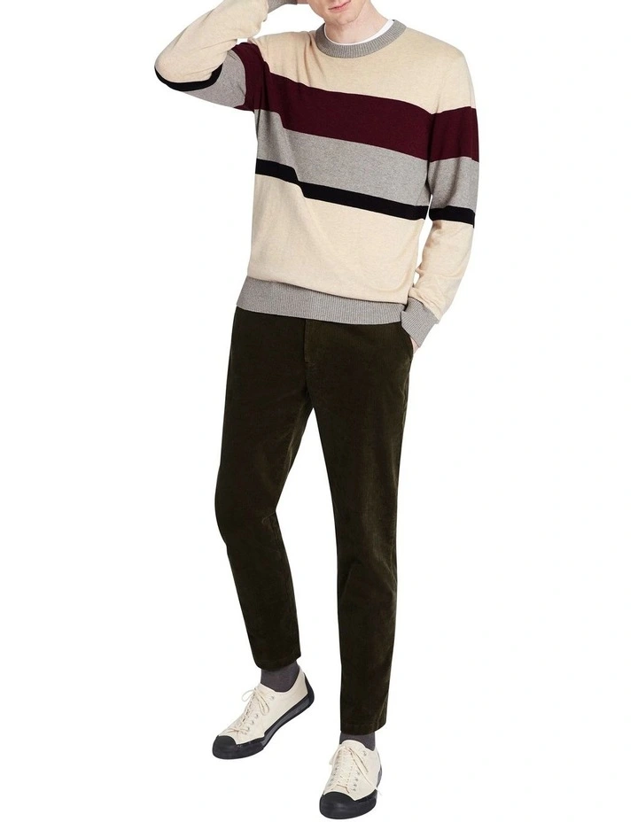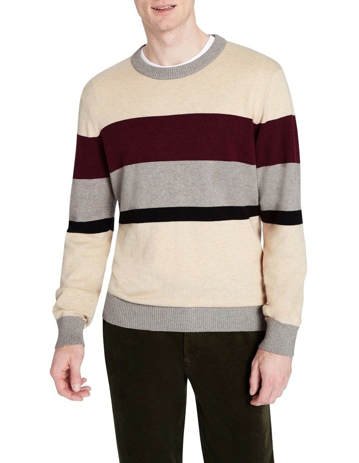 Fabulously soft, this long sleeve knit sweater is all about touch, creating a lightweight look made from a fine yarn blend of cotton, cashmere and wool. Offering a regular fit with a flattering crew neckline, the sweater flaunts bold stripe detailing in shades of dark red, grey marle and black against ivory, accentuated by grey rib trim at the neck, sleeve cuffs and body hem.