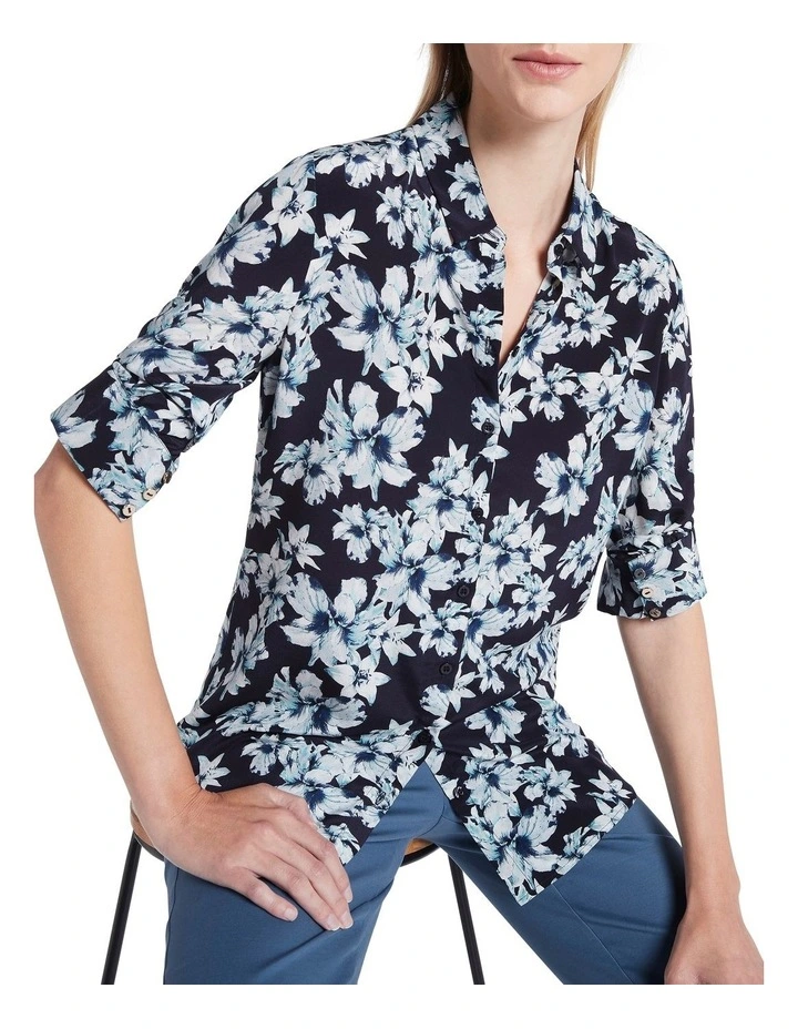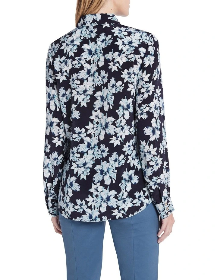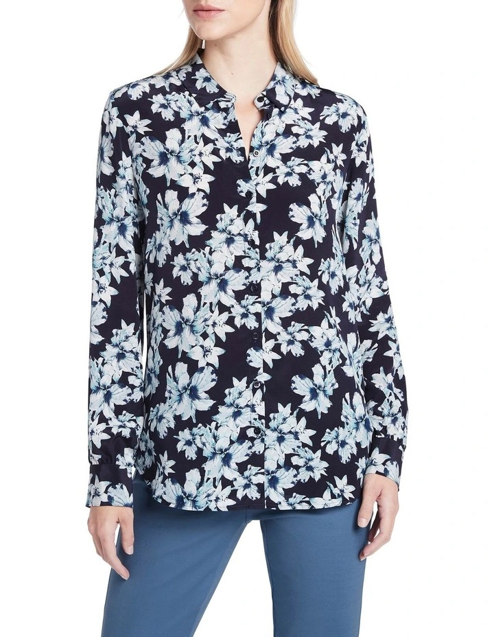 Endlessly soft, this blouse drapes beautifully through pure silk, to reveal a captivating floral print on a dark navy base. Offering relaxed shaping with a curved hem front and back, the blouse fastens at the front with a classic button closure, completed by a soft shirt collar and long sleeves with neat button-up cuffs.