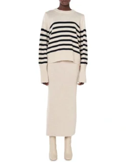 Featured in a soft 100% Merino Wool yarn, our new Stripe Sweater is a versatile piece this season. Featuring contrast stripe detail and crew rib neckline. Styled with our matching Merino Wool Ribbed Skirt.Â