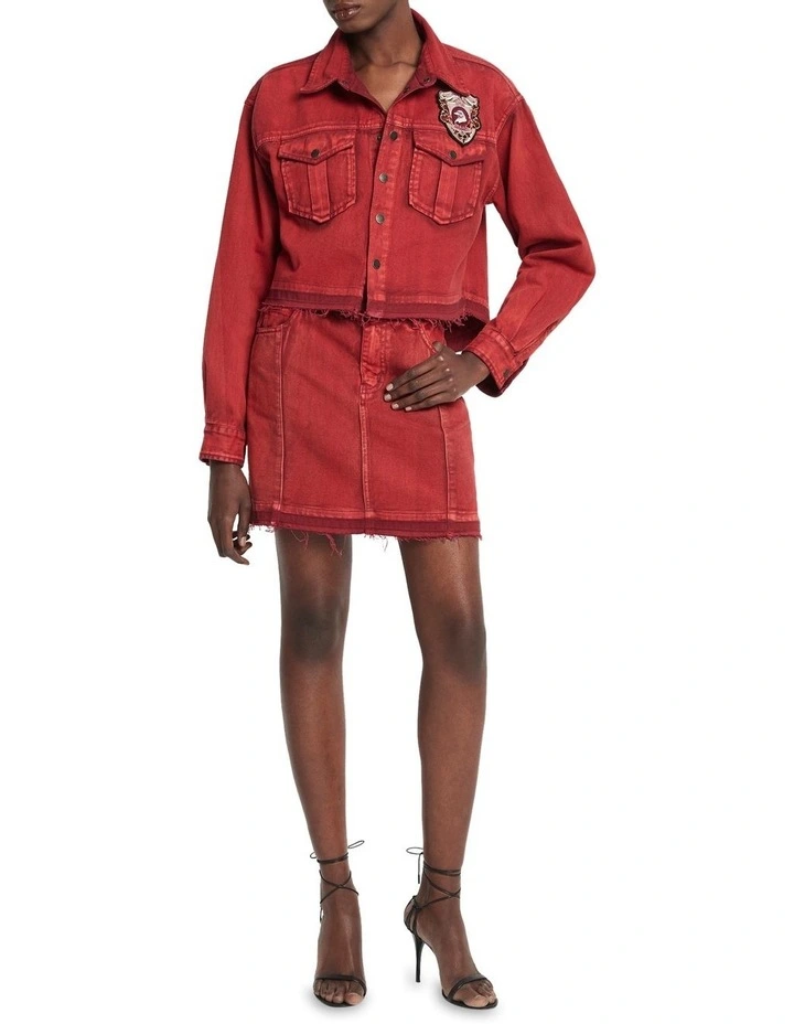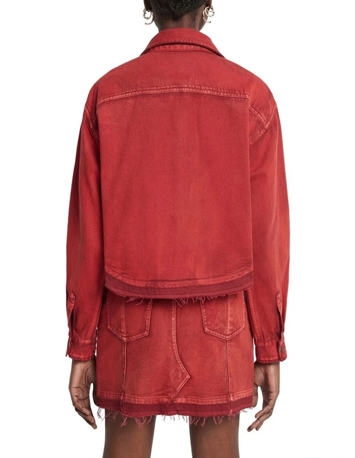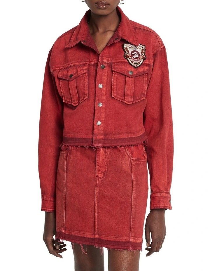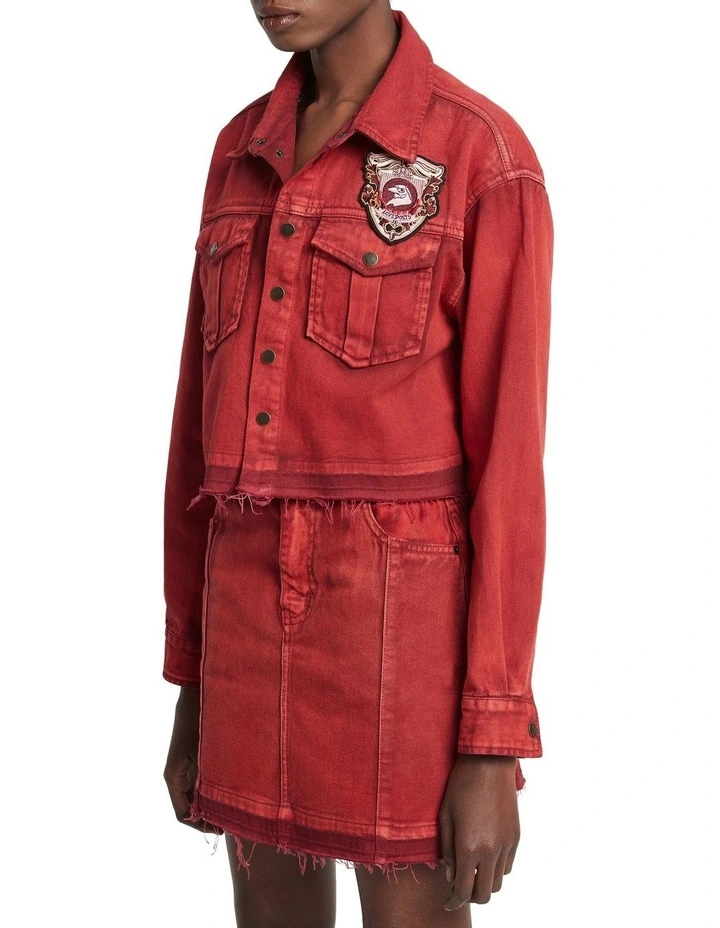 Flaunting a warm, washed cherry colouring, this denim jacket raises the bar with an oversized, relaxed fit, paired with an on-trend cropped silhouette. Made from all-cotton denim, the jacket shows off further detail in flap patch pockets and crest embroidery at the chest, sass & bide branded hardware, and contrast raw edge detailing at the hem.