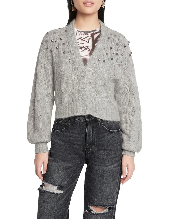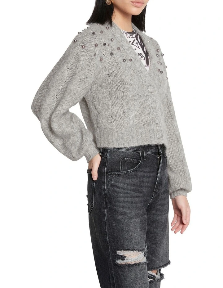 Revealing a pale marle grey colouring, this exquisitely soft knit cardigan is made from a yarn blend containing fluffy mohair and wool, knitted in a softly textured open stitch with cable detailing throughout. Showing off a slim, cropped silhouette with long blouson sleeves, the cardigan is completed by pearl embellishment at the shoulders and yarn-covered buttons.