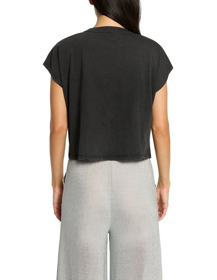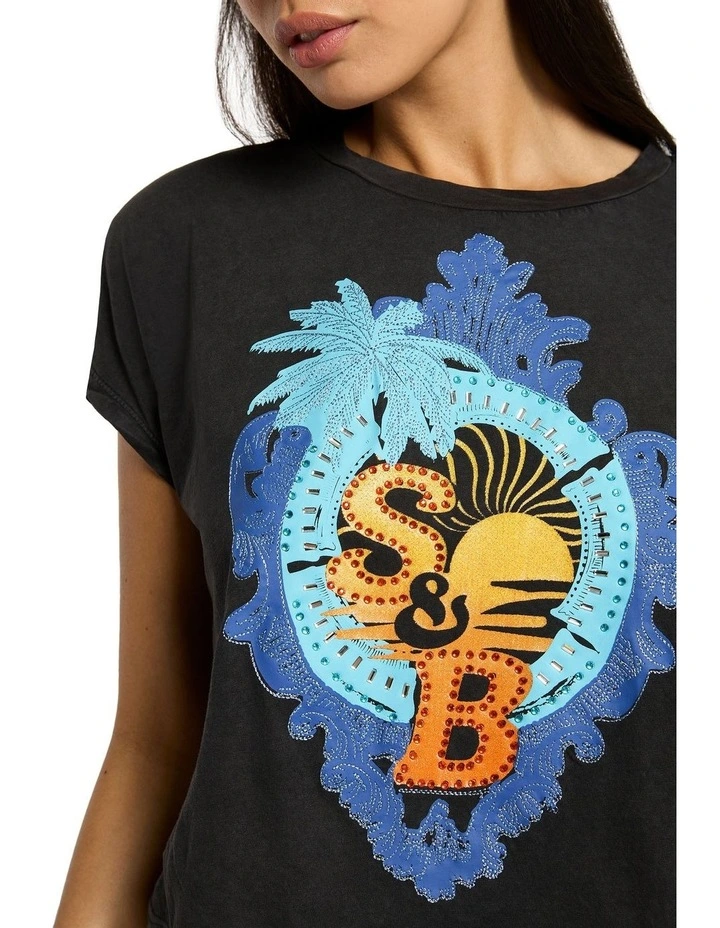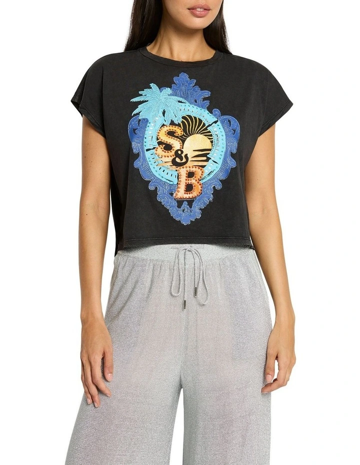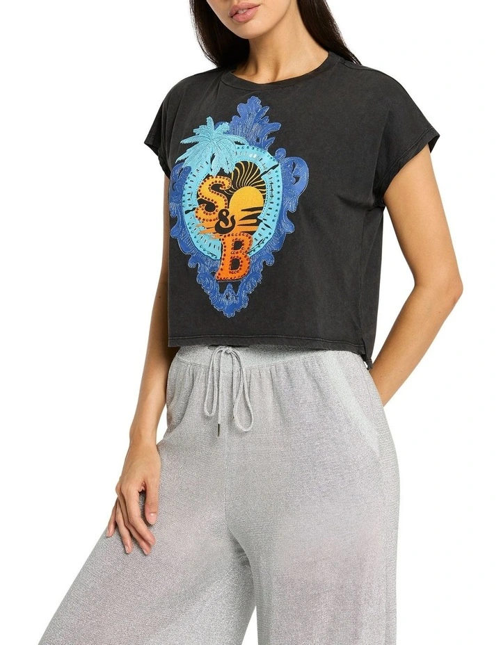 Accenting its bold, colourful artwork with glittering beaded embellishment, this tee keeps its cool in faded black, as it sits soft against the skin in pure pima cotton. Revealing relaxed shaping within a cropped silhouette, the tee flatters further with a rib crew neckline, grown-on short sleeves, and a slight stepped hem with small split detailing at the side seam.