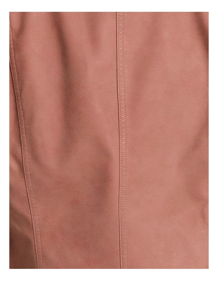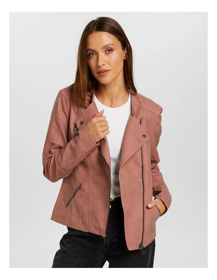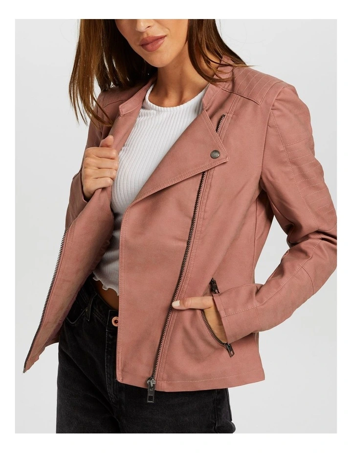 Short faux leather jacket, with stand up collar, quilted detail at shoulders, metal zippers at sleeve openings.