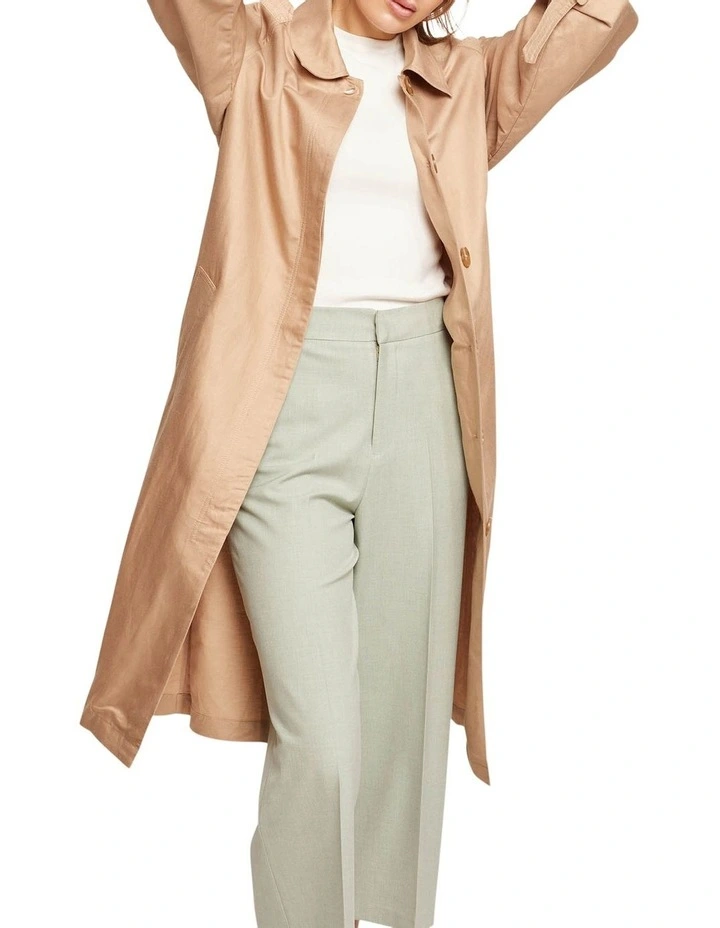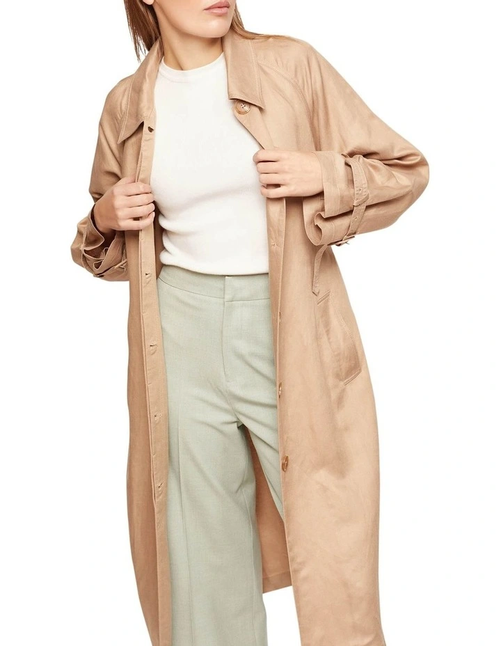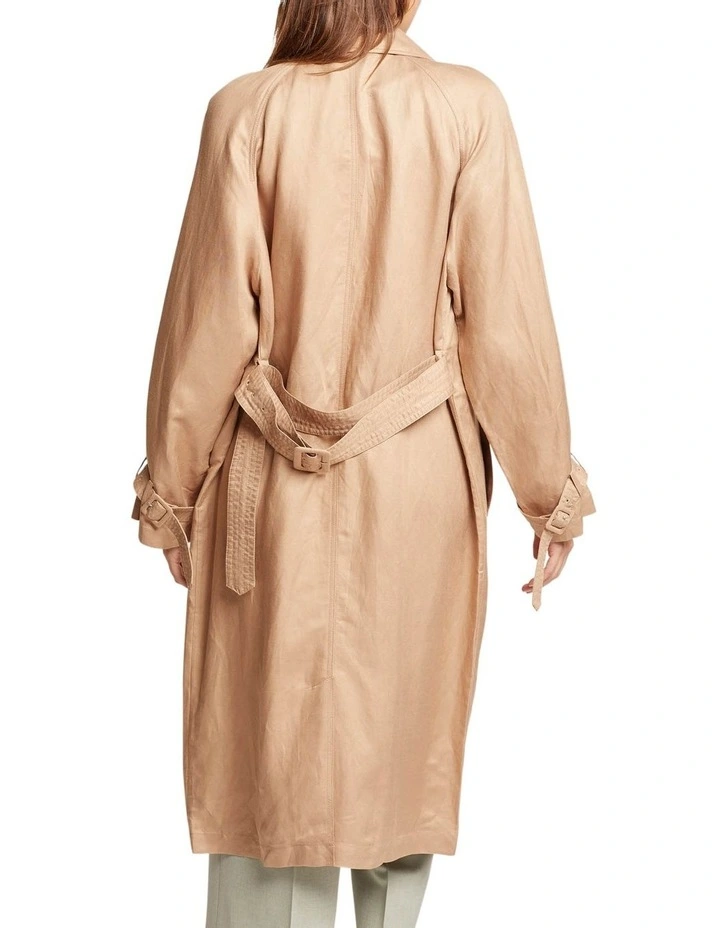 The Sherlock Linen Blend Trench Coat is elementary style for the trasnseasonal months. This chic coat is crafted from a light and breathable linen bend and cut in a relaxed fit. It evokes the classic trench coat design with a belted waist, statement collar, belted cuffs, and side pockets. Team it with a knitted top, culottes, and leather sandals to complete the look.