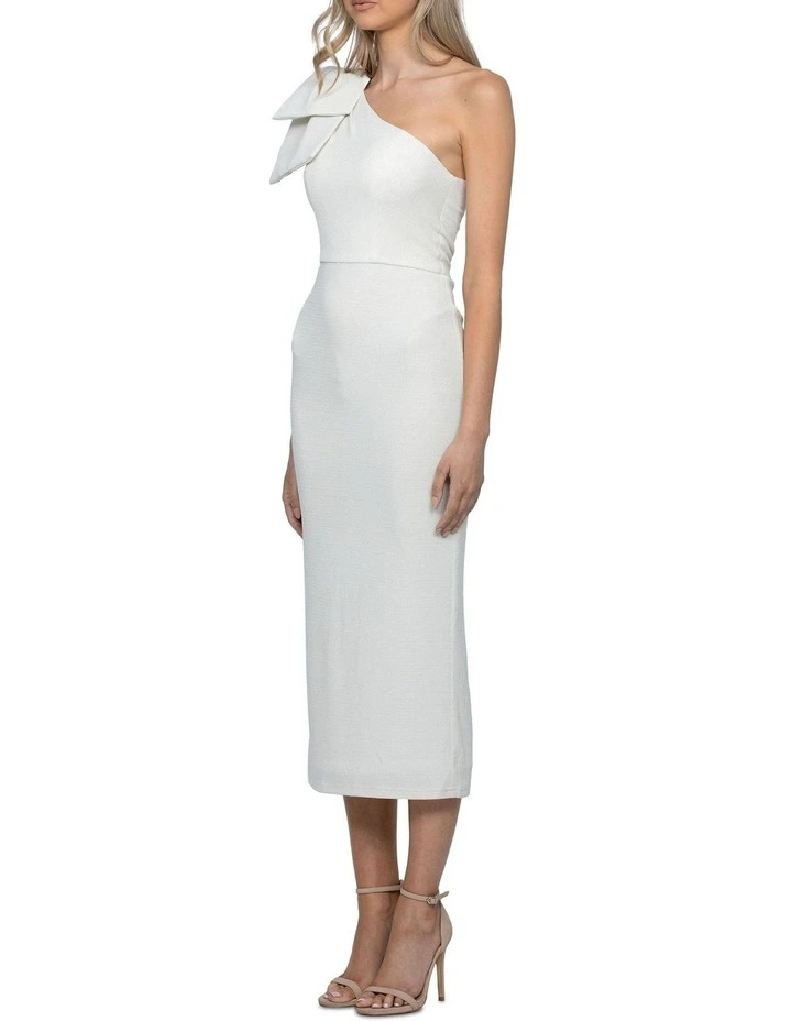 A Bariano staple, the pearl one shoulder midi is a simple, yet flattering piece that will never date. Crafted in an off white delicate stretch fabric with a gold lurex thread to add an element of luxury to an elegant classic.Â