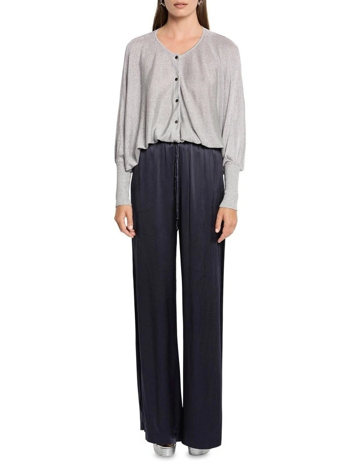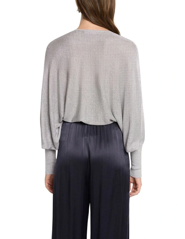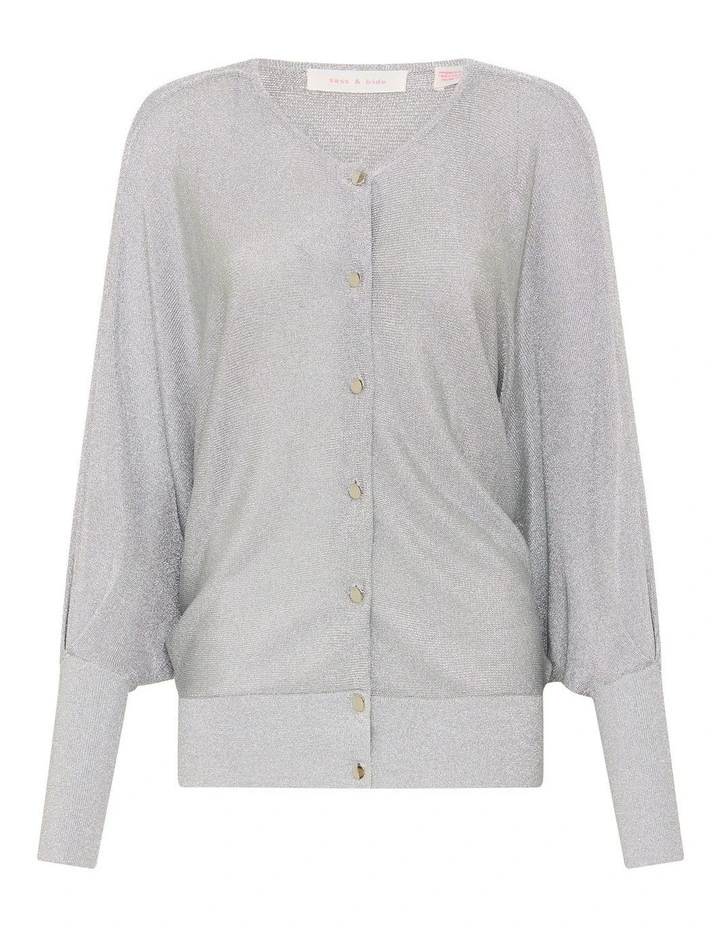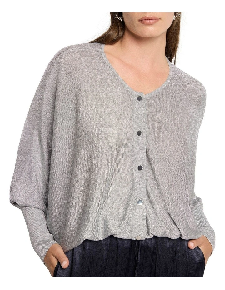 Adding shimmer to your everyday, this silver knit cardigan creates a beautiful layering piece, delivering a lightweight look within a fine knit stitch. Fastening at the front with shiny metallic silver buttons, the cardigan shows off relaxed shaping within a draped batwing silhouette, further enhanced by an open V-neckline, and extended slim rib cuffs at the full length sleeves.