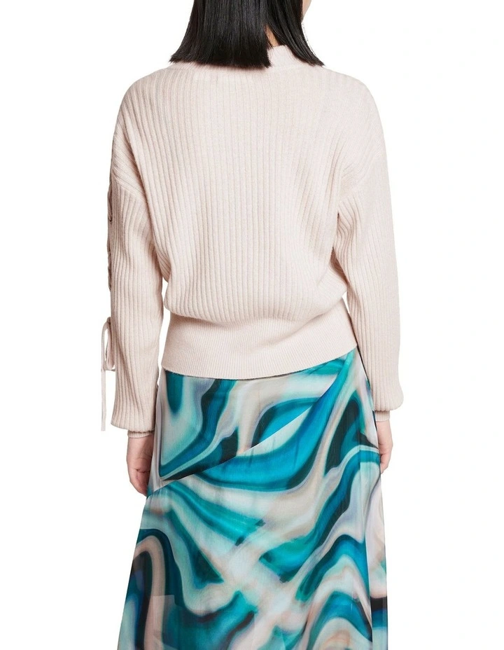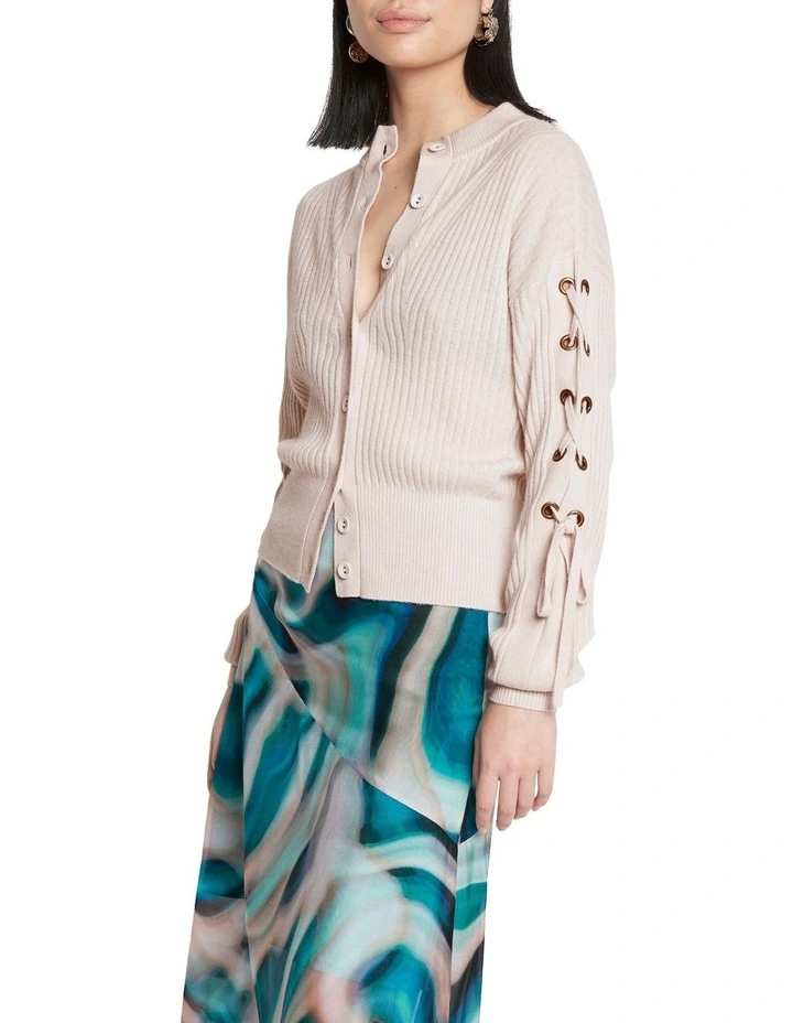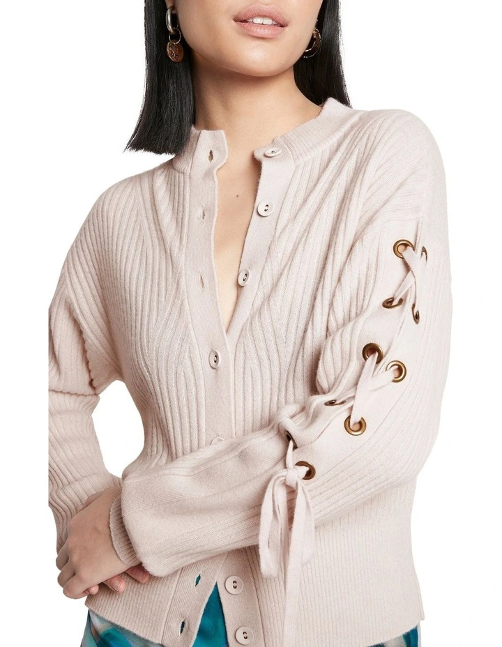 Exquisitely soft, this rib knit cardigan is made from pure cashmere yarn, revealing a pale Himalayan pink salt colouring. Offering a boxy fit with dropped shoulder shaping, the cardigan draws in at the waist with a fine rib waistband, with further detail found in the full button fastening, and antique brass eyelet and tie detail on the outer left arm.