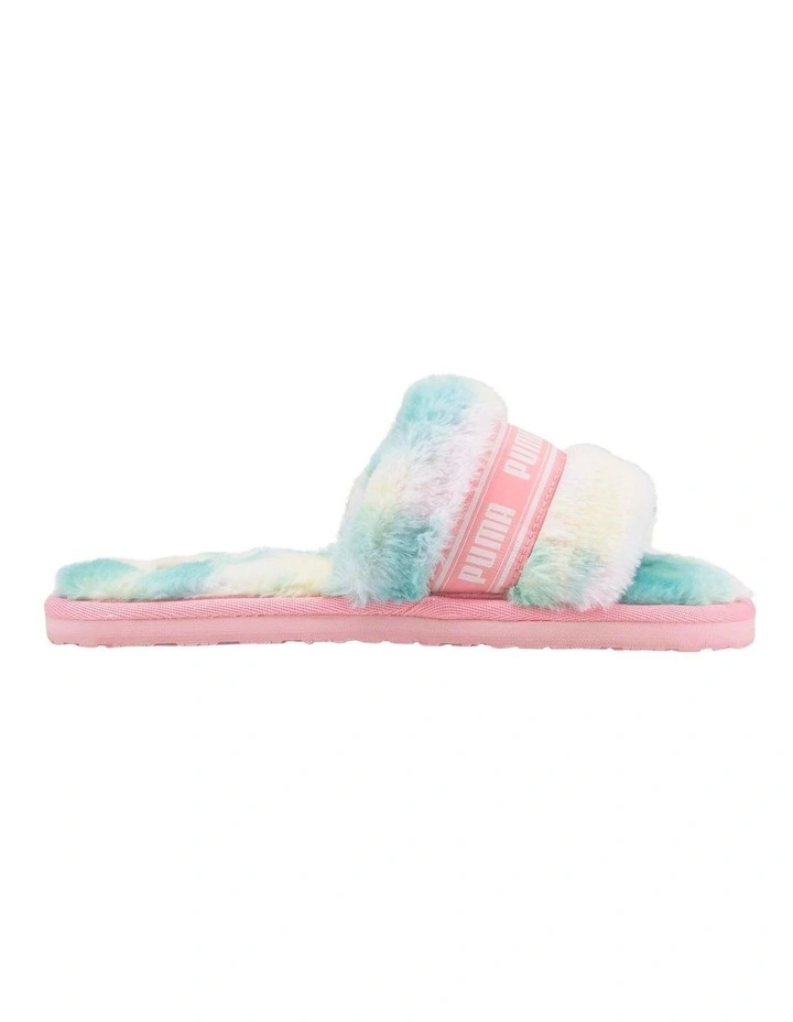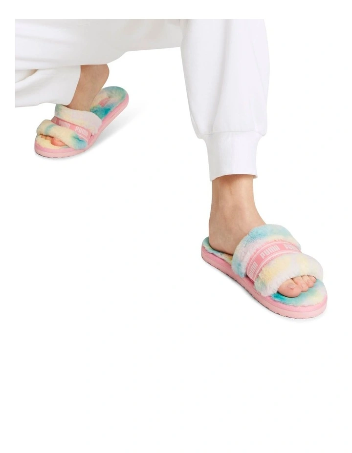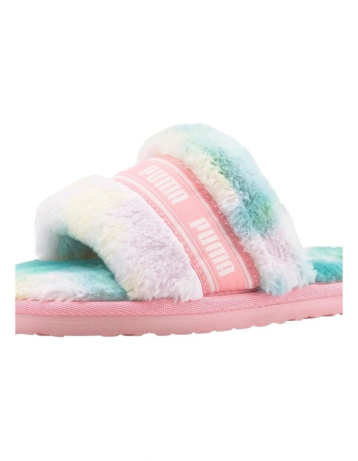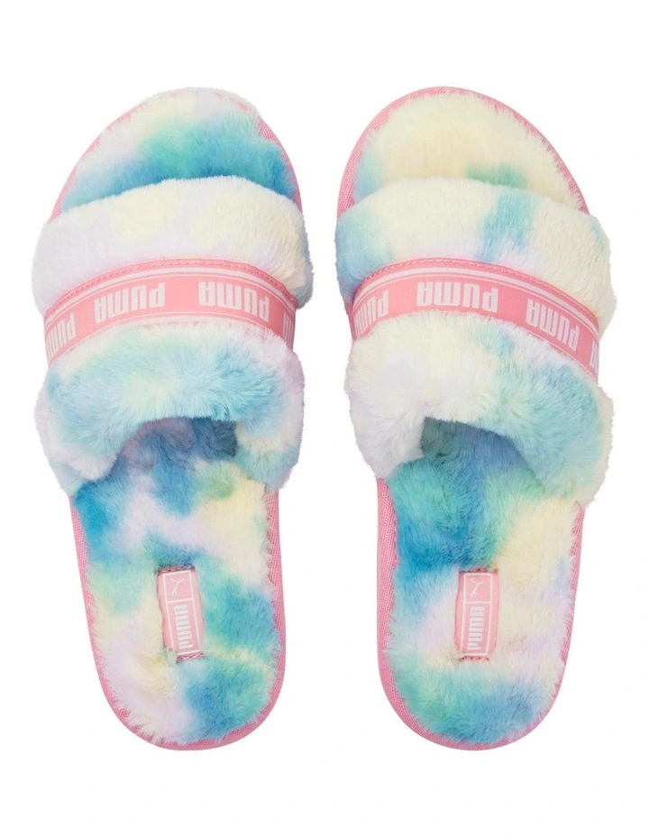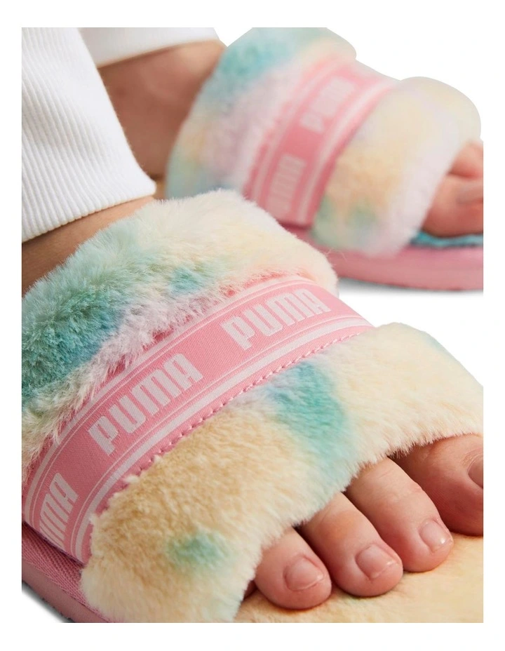 Enjoy the feeling of being at home with these fuzzy slippers. The Puma Fluff Tie-dye slide is a fluffy slipper with a colorful tie-dye faux fur strap highlighted by a repetitive PUMA branding across the upper strap. The slipper also features a nonslip EVA outsole. The soft and plush faux fur slipper is designed to keep you warm and snuggly at all times- in and outside your home!