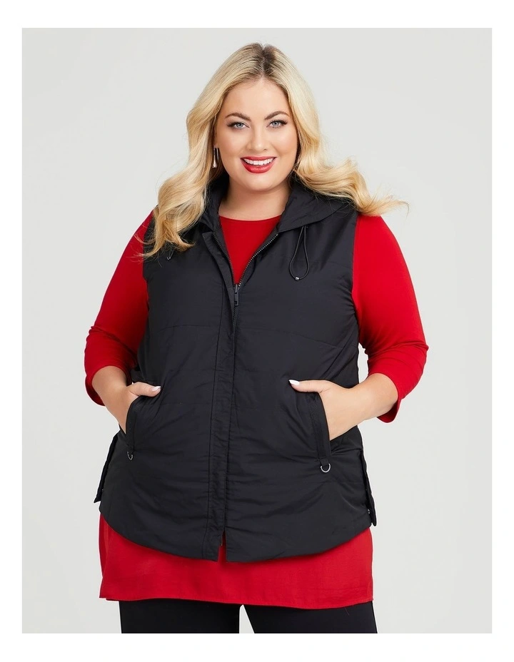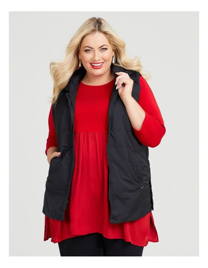 Elevate your outerwear game with the Essential Puffer Vest form Taking Shape. This plus sized vest is not only practical but also stylish with its reversible design – one side is plain black and the other features a playful black dot pattern. The elastic ties at the collar and the hood that folds into a collar add a touch of chic to this functional piece. The side pockets with fleece lining keep your hands warm , while the two way zip closure allows for easy layering. The side splits with snap buttons make it comfortable to move around in while still maintaining a sleek silhouette. Wear it with skinny jeans and ankle boots for a casual weekend look, or layer it over a sweater dress for a cozy yet chic outfit. The essential Puffer Vest is a versatile and must have addition to any winter wardrobe.