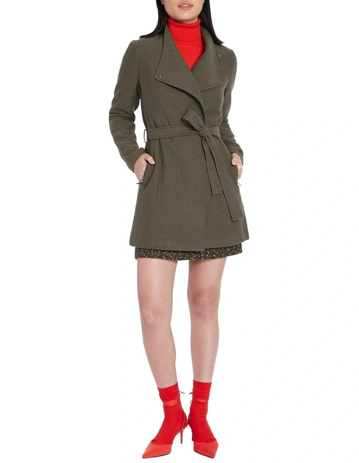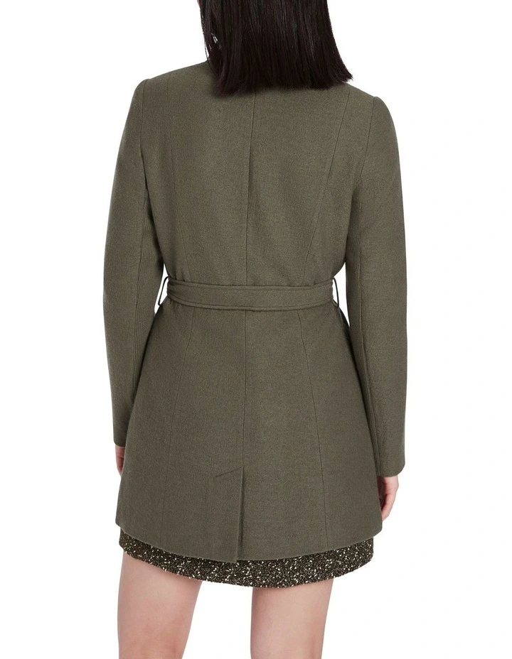 Made from pure Australian Merino wool, this washed khaki coat has been knitted rather than woven to ensure easy stretch and movement, while remaining warm and lightweight. Wrapping across the chest, the coat creates a long-line silhouette, fastening with a draped self-tie belt and metal snap closure buttons, complete with pockets at the hip.Â