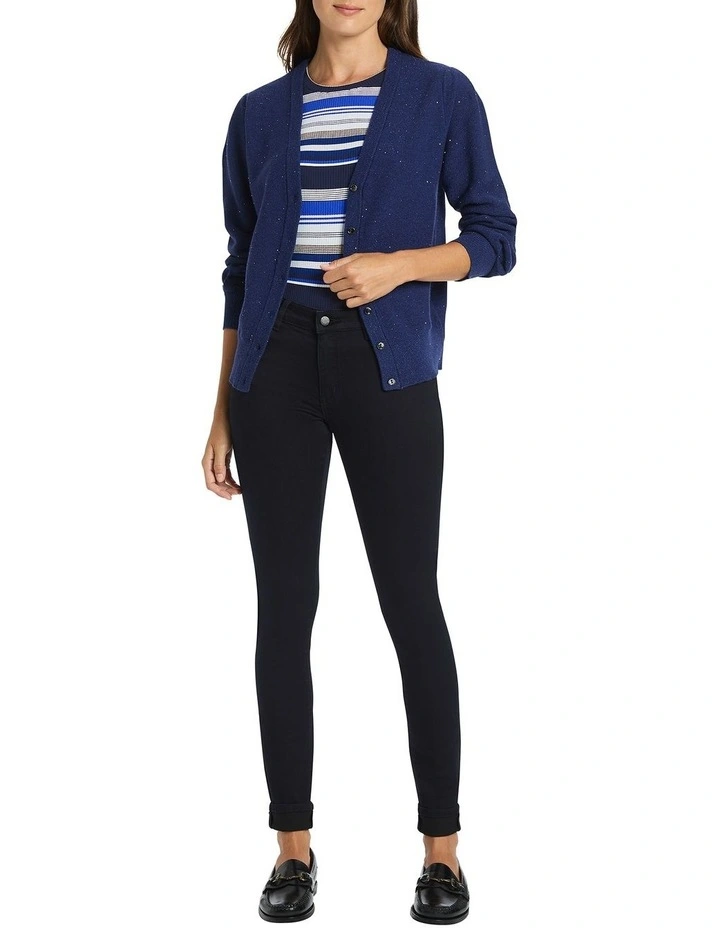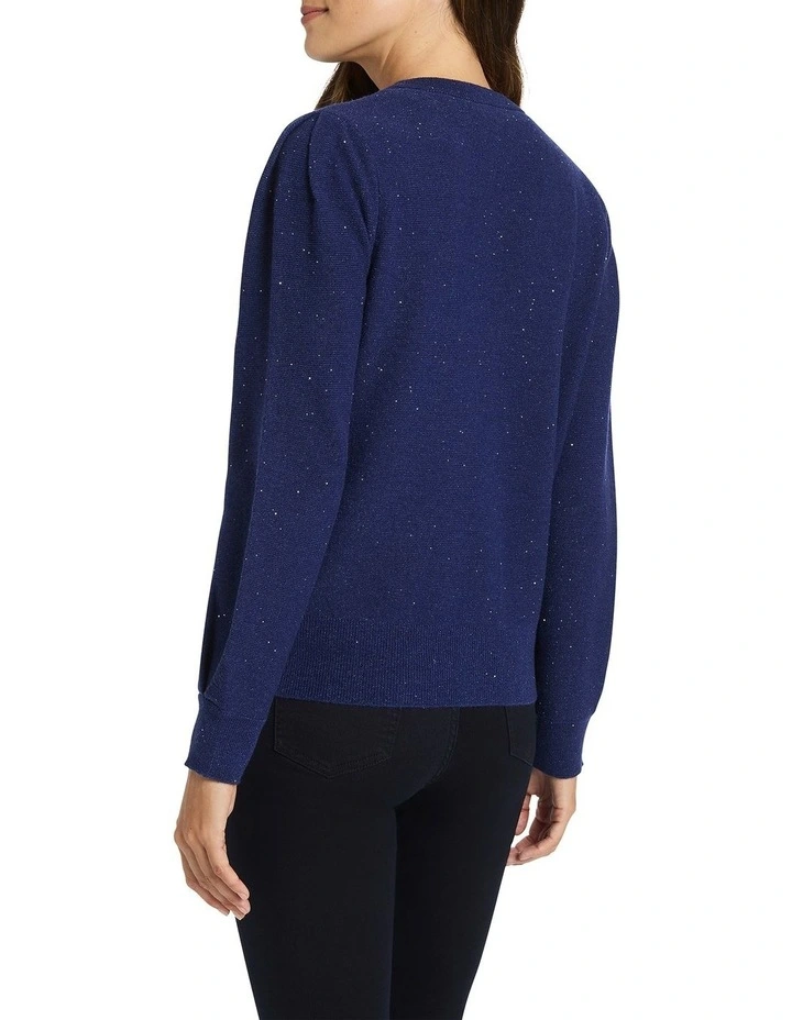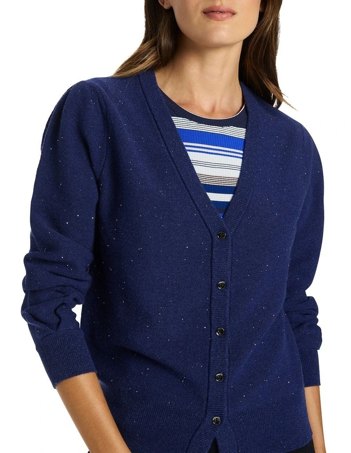 Enveloping you in a luxury wool blend, this cardigan creates an easy neutral in rich navy, accented with delicate sequinning and shimmering threads of lurex throughout. Buttoning at the front to create a deep V-neckline, the cardigan delivers a flattering slim fit, completed by subtle balloon shaping at the long sleeve, and fine rib trim at the neck, cuffs and body hem.