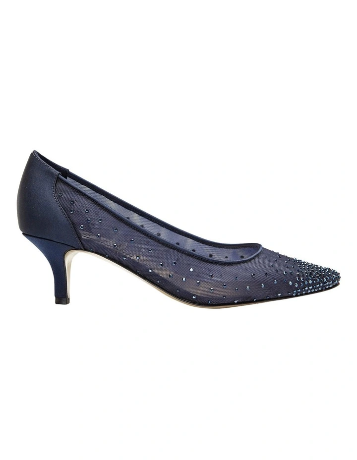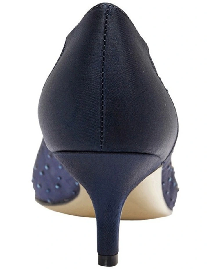 Our favourite elegant point toe pump has been re-designed at new heights. Delicately dressed with a navy satin trim and matching jewel embellishments, this style is wins best dressed at every occasion.Â