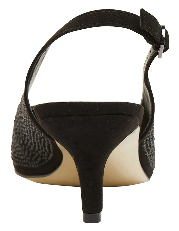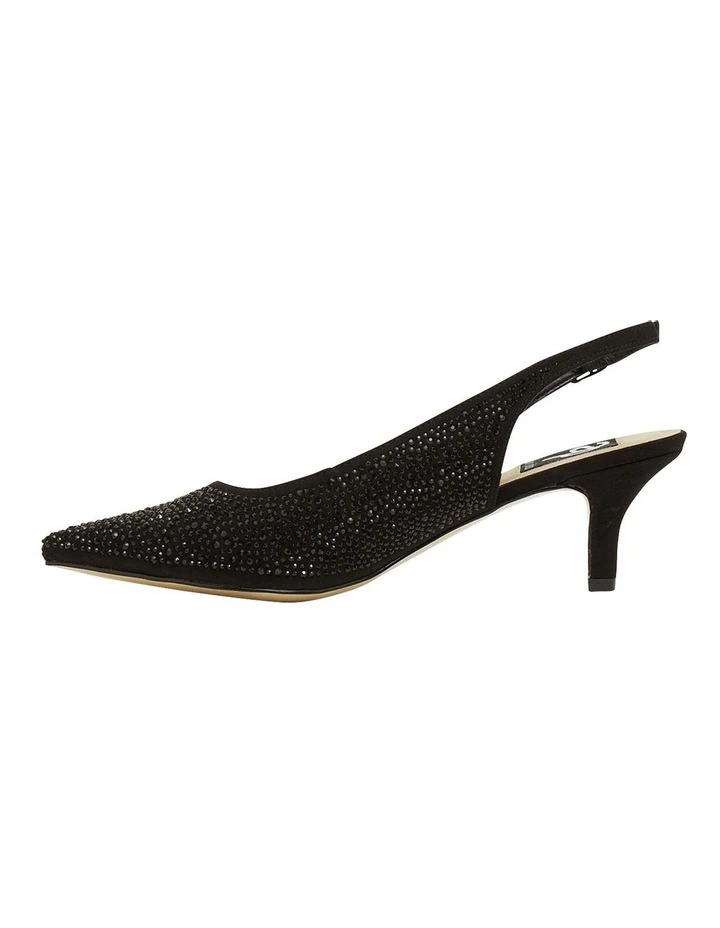 Dazzle on the dance floor with Teagan. This sleek kitten heel pump is adorned with embellishments, an adjustable sling back strap and on-trend pointed toe heel.