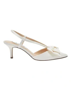 These elegant point-toe satin slingbacks are adorned with a pretty bow sitting at the vamp. A most classically feminine pump.
