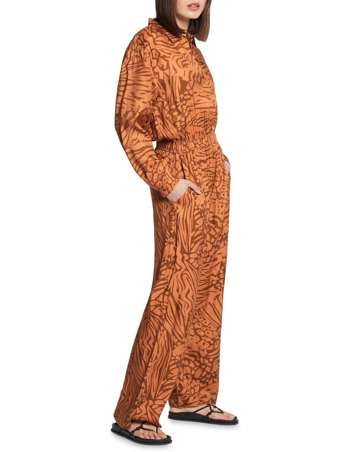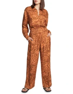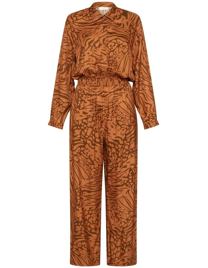 Utterly captivating, this wide leg jumpsuit flaunts rich, warm tones within a bold print, while flowing effortlessly through soft viscose to reveal a relaxed fit throughout. Creating shape at the waist with an elasticated waistband, the jumpsuit is further accentuated by a button front closure below a sharp shirt collar, long relaxed sleeves and handy pocketing at the hip.