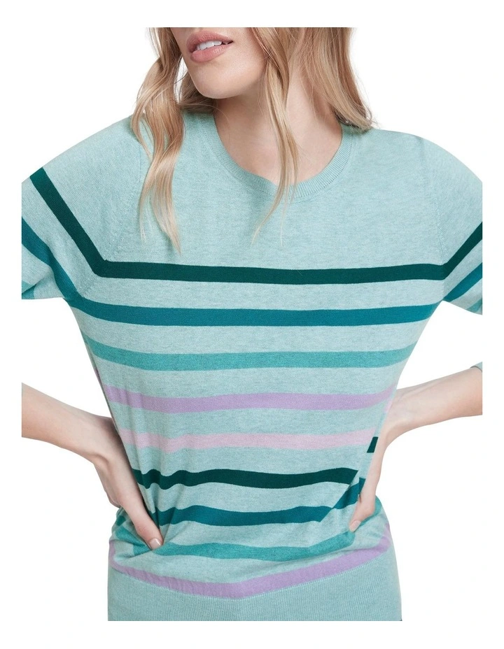 Endlessly soft, this long sleeve knit top delivers a lightweight look, made from a fine yarn blend made up of cotton, silk and cashmere. Revealing a melange effect within a pale blue-green hue, the top cant help but draw the eye to its multi-hued horizontal stripe, while keeping it simple elsewhere within a regular fit, with rib trim at the crew neckline, sleeve cuffs and body hem.