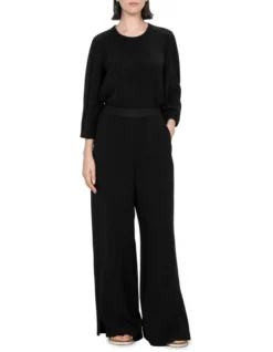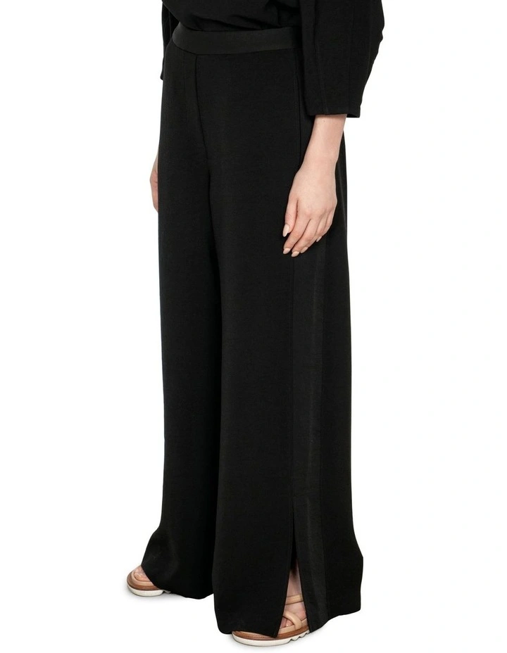 Cut in a washed crepe fabrication, these new season pants are a twist on a classic. Designed for a drapey fit, these pants fall to a wide leg silhouette and are defined by satin contrast panels and waistband. Pair with a fine knit tee and sandals for an effortless weekday look.