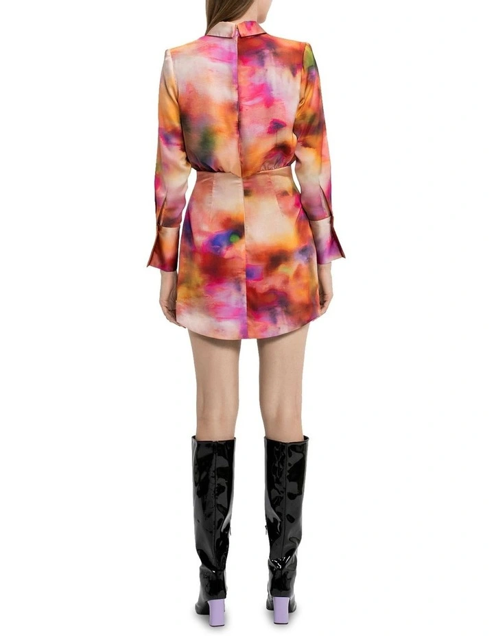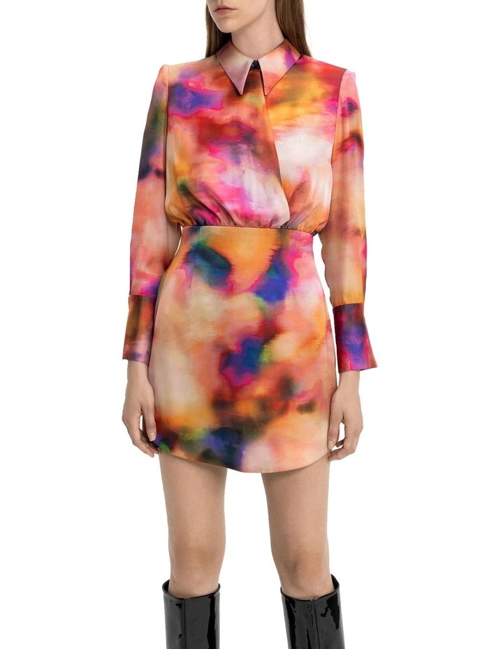 Crafted from French watercolour satin, which contains 33% recycled polyester, this mini dress is designed to add some colour to your wardrobe. Featuring a draped bodice, fitted waist and long sleeves with crisp shirting details. Pair back with your favourite heels for a fun modern look.