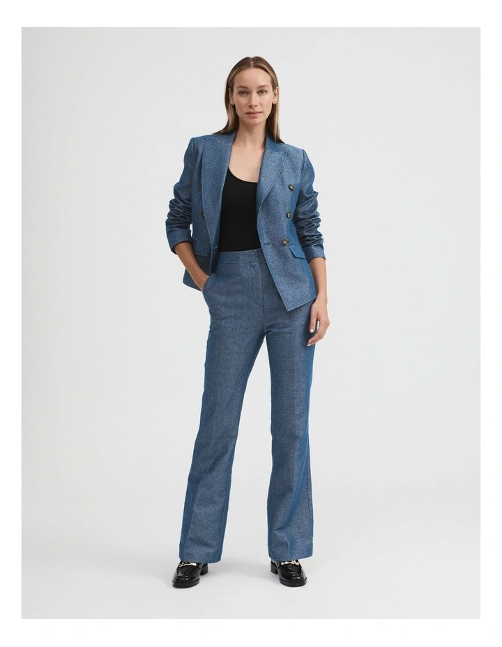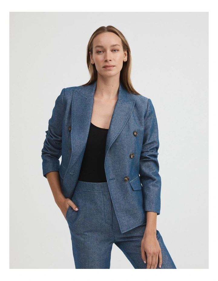 - Double-breasted silhouette with peaked lapels